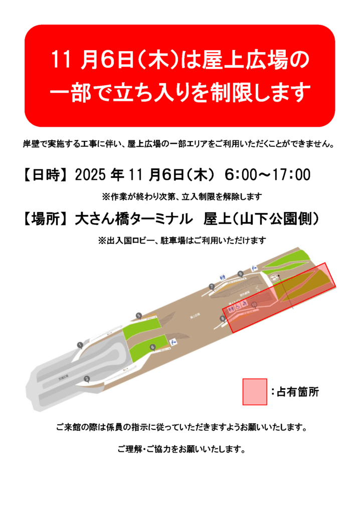屋上広場の一部で立入を制限いたします。ご理解・ご協力のほど、よろしくお願いいたします。