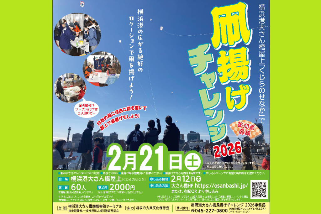 横浜港大さん橋国際客船ターミナル(指定管理者:一般社団法人横浜港振興協会)では、2月21日(土)に横浜港を一望できる屋上広場(通称:くじらのせなか)で「大さん橋凧揚げチャレンジ」を開催します。