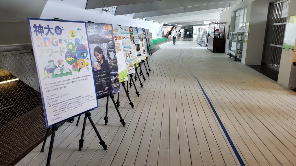 横浜港大さん橋国際客船ターミナルでは2024、2025年度の神奈川大学SDGsアワード受賞作品展示を3月27日(金)から4月12日(日)まで、2Fロビーにて開催しています。